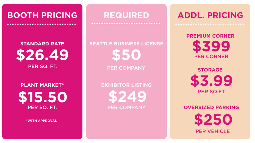 The Northwest Flower & Garden Festival offers a wide range of booth options. Whether you are selling plants, garden tools or art, we have the right spot for you.