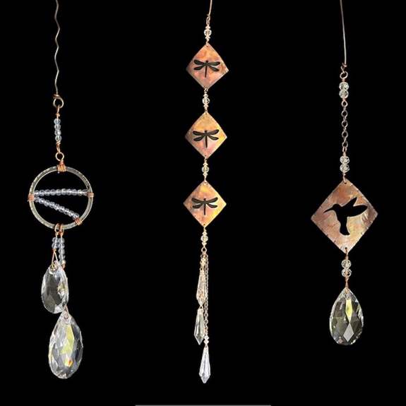 Adorn your garden and home with the warmth and subtle whimsy of copper art. I create plant sticks, window hangings, wall hangings, and plant holders.With a silver smithing background, I bring a jeweler’s eye to my home and garden copper art, adding meticulous attention to detail. My work uses traditional metal smithing techniques, from a jeweler's saw to soldering with silver solder and forging. All my copper components are handmade down to the hooks.