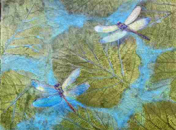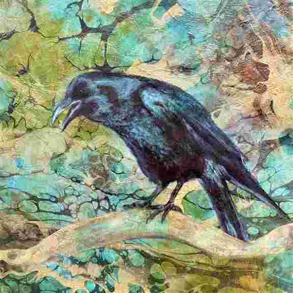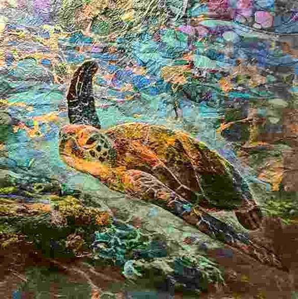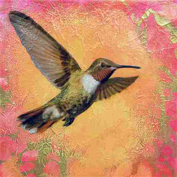Layered mixed-media paintings with luminous, textured backgrounds and bold, contemporary imagery. Acrylics, oils, metallics, and rice paper create depth, motion of light, and an almost three-dimensional feel.